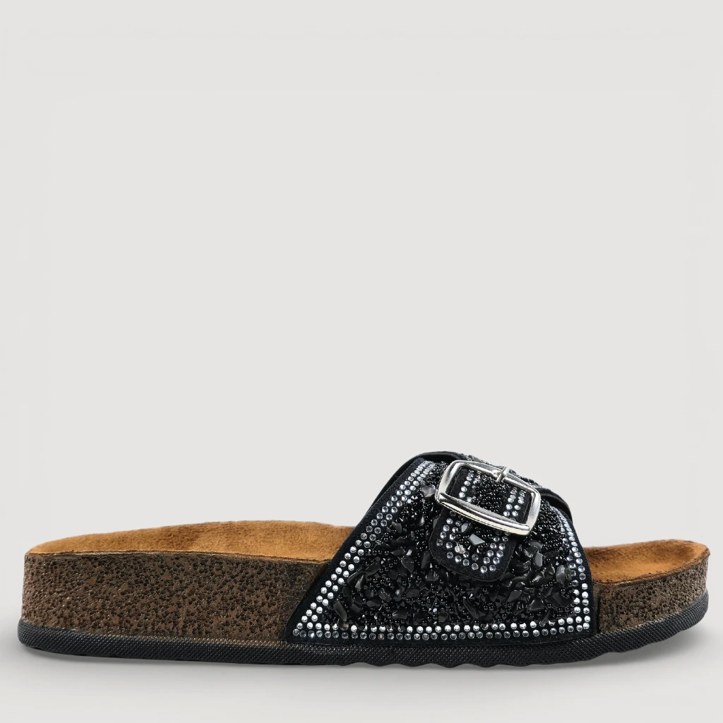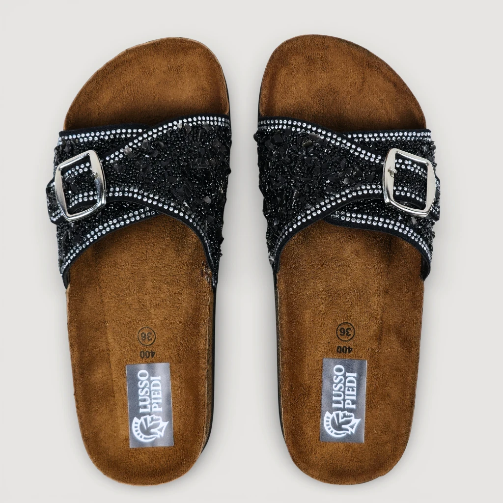 Die Lusso Piedi Capri Pantoletten vereinen Komfort mit einem eleganten und funkelnden Design. Der aufwendig verzierte Riemen mit Strassdetails macht diese Pantoletten zu einem echten Blickfang – perfekt für Sommer, Urlaub oder besondere Anlässe.