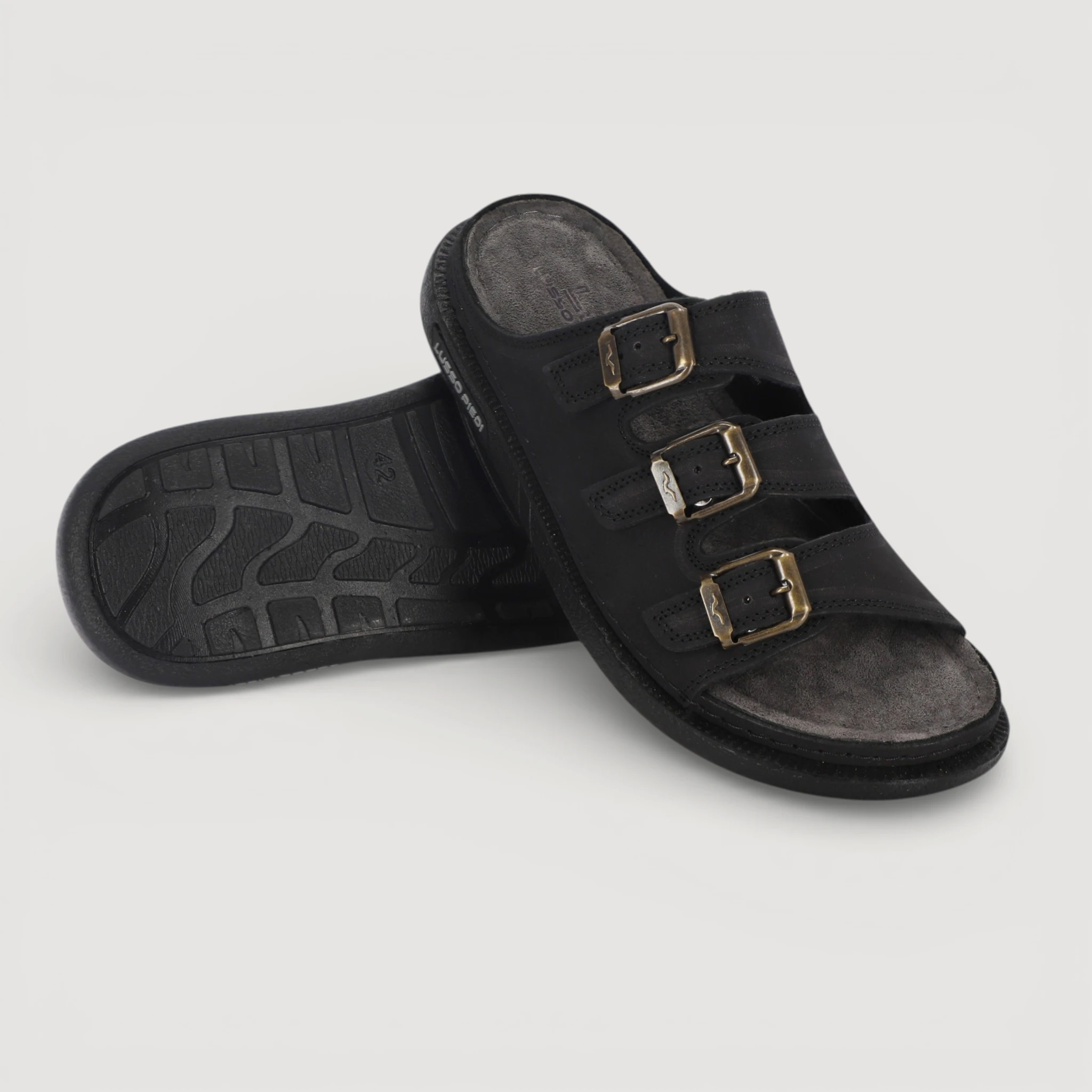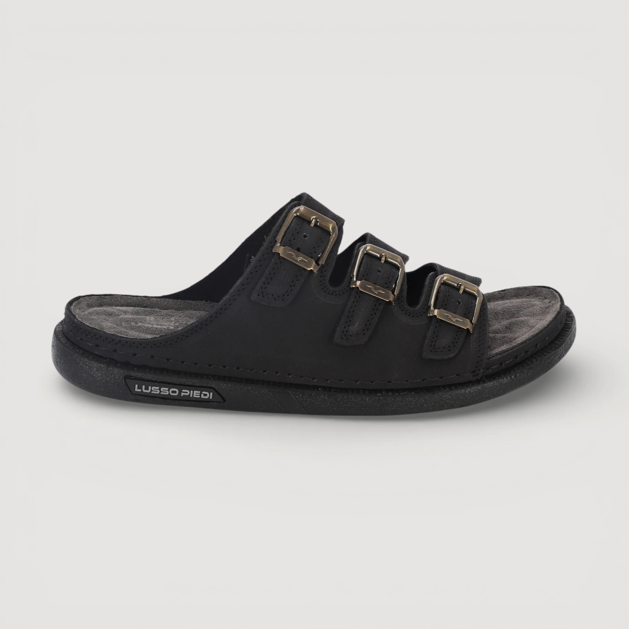 Die Lusso Piedi Napoli Pantoletten aus hochwertigem Echtleder (Nubukleder) verbinden klassischen Stil mit hohem Tragekomfort. 3 Verstellbare Metallschnallen, ein ergonomisches Fußbett und eine flexible Sohle sorgen für eine perfekte Passform und ein angenehmes Laufgefühl im Alltag.